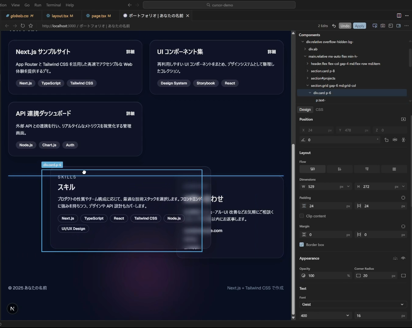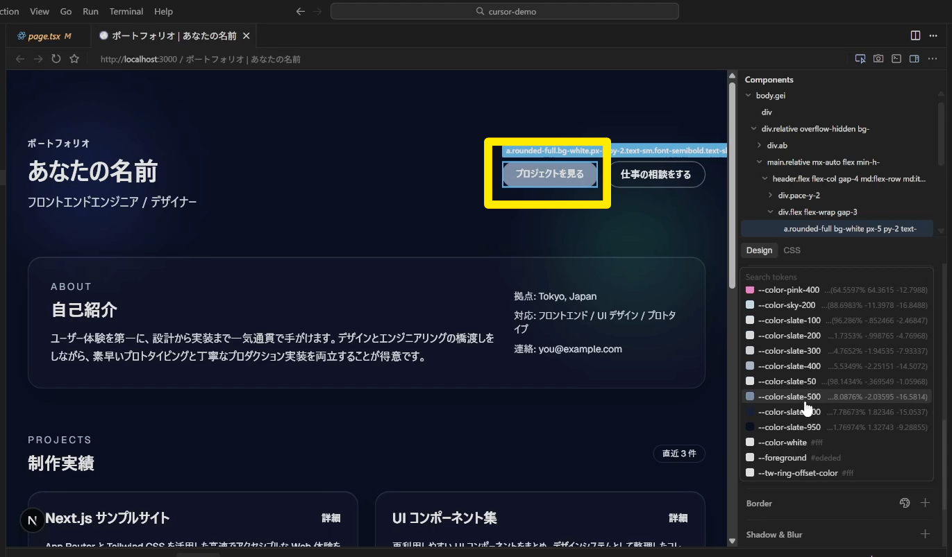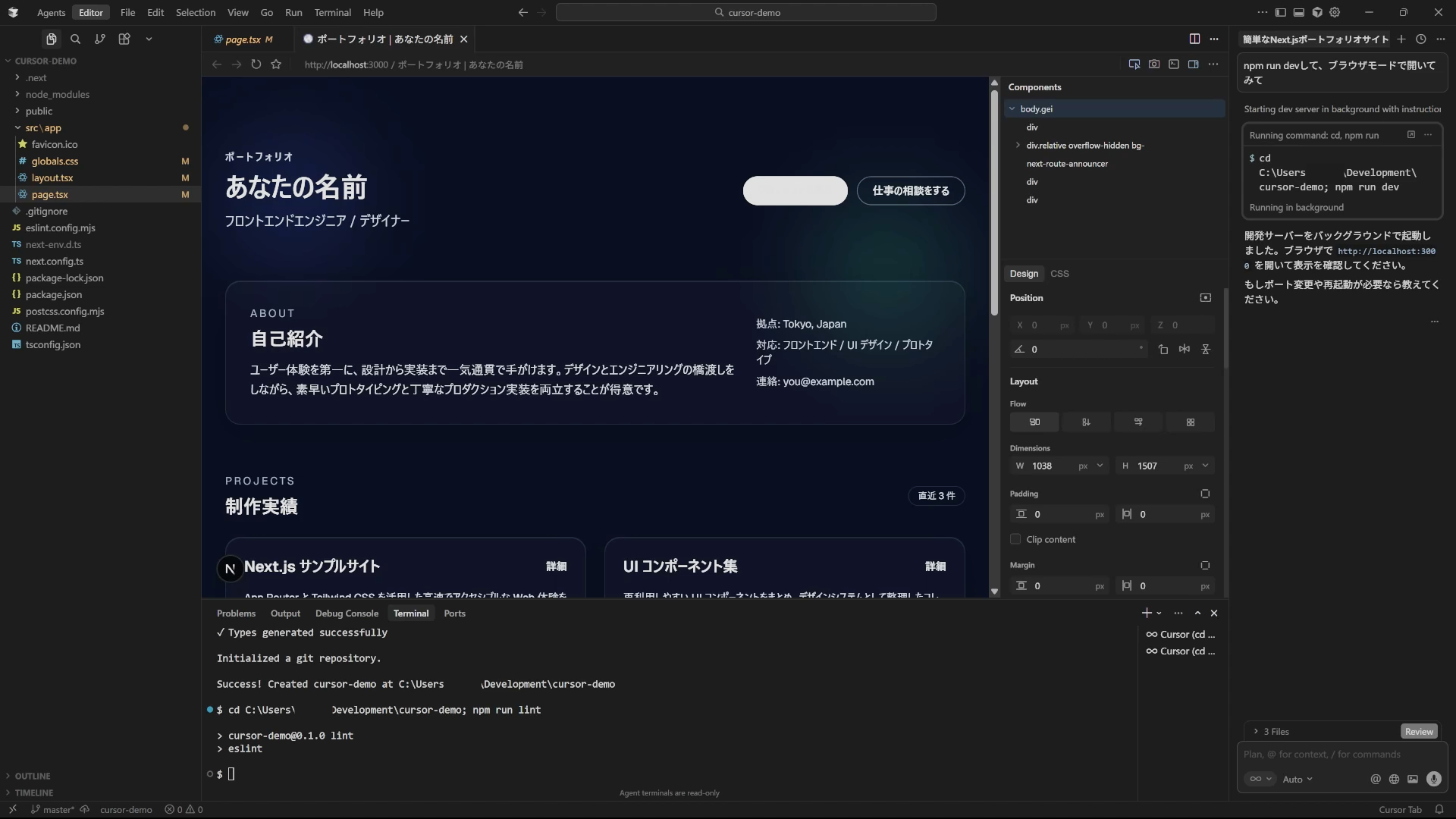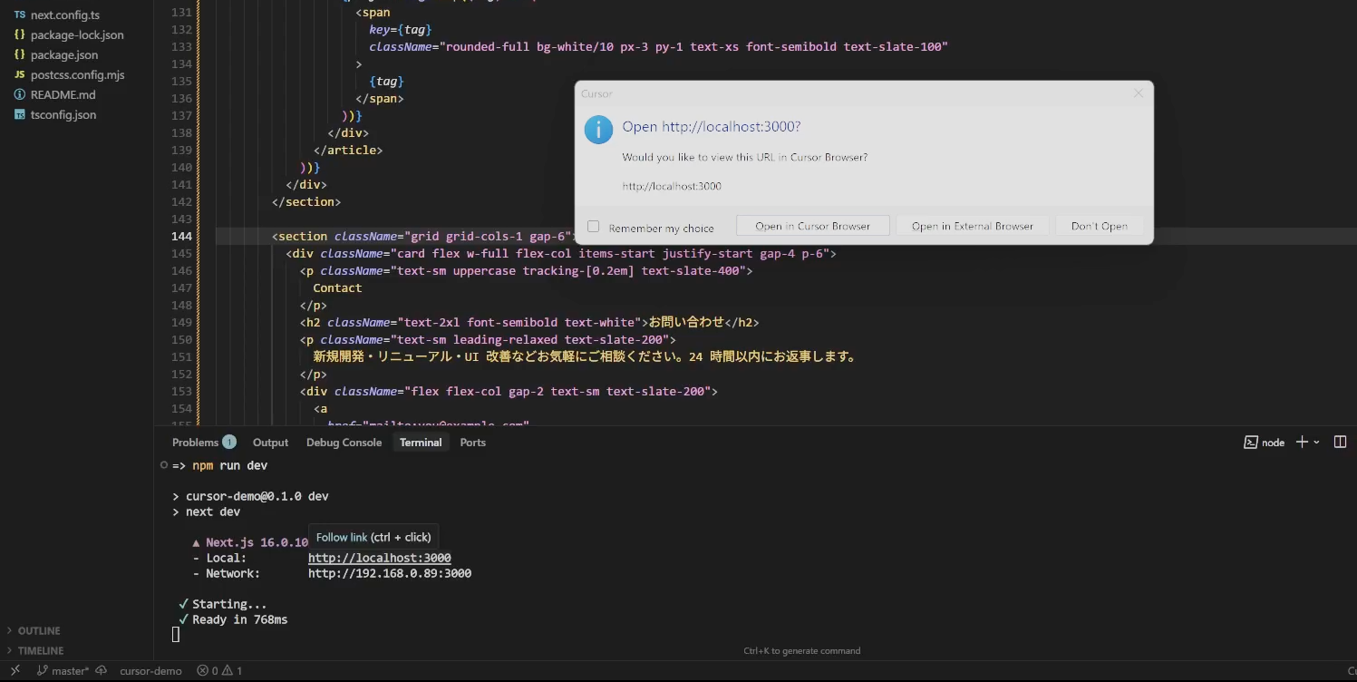 ちなみに今(2025/12/12現在)Cursorを立ち上げると上のようなサジェストが出ます。これで試してみることもできますが、今回はポートフォリオサイトのデモをNext.jsでちゃちゃっと作ってもらいました。
