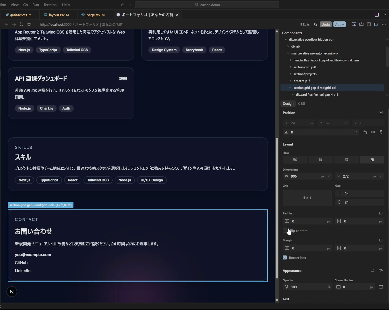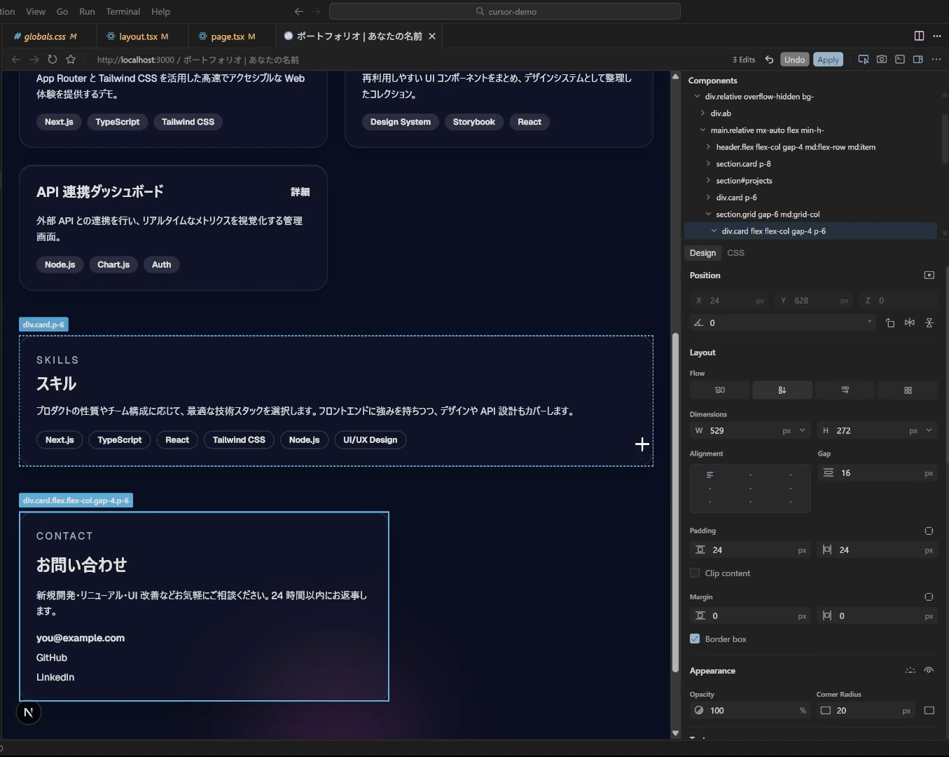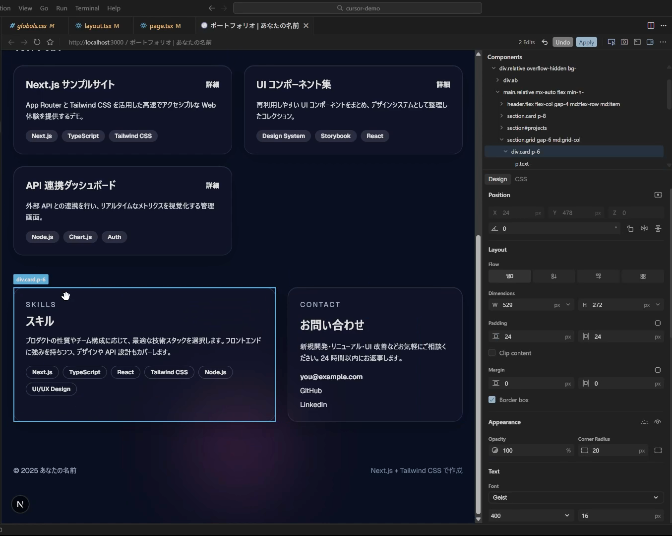 ちなみに今(2025/12/12現在)Cursorを立ち上げると上のようなサジェストが出ます。これで試してみることもできますが、今回はポートフォリオサイトのデモをNext.jsでちゃちゃっと作ってもらいました。