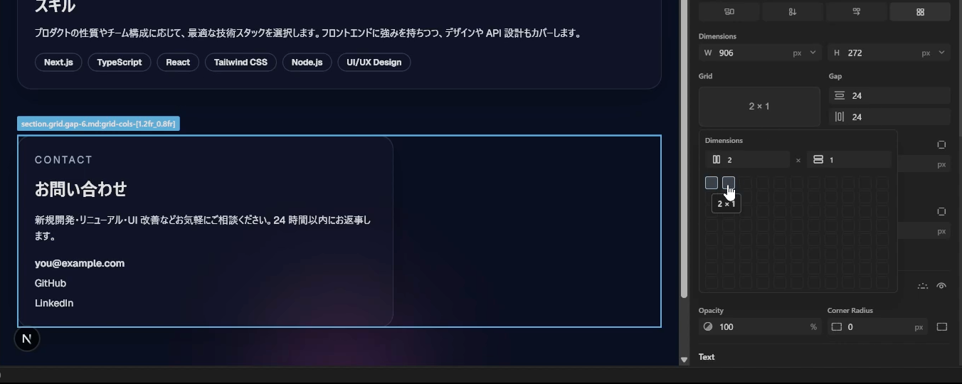もうちょっと修正を進めてみましょう。「スキル」と「お問い合わせ」のカードが横並びになっているのは少し不自然です。