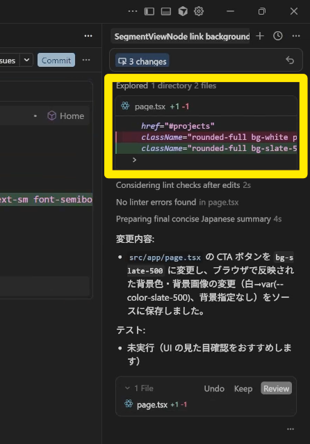 あとはビジュアルエディタの上にある「Apply」ボタンを押せば、AIがその時点でブラウザ表示されている見た目になるようにコード側に変更を加えてくれます。